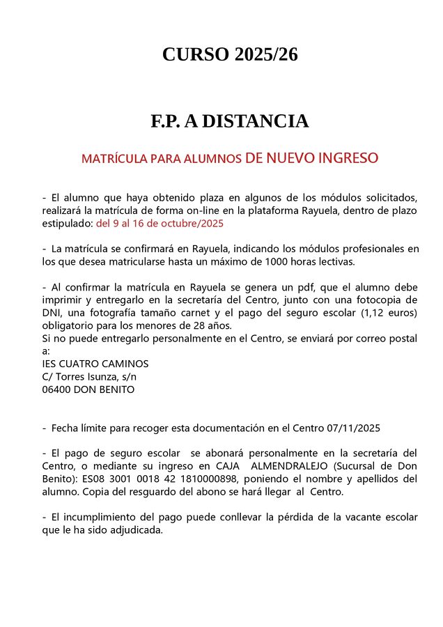 F.P. A DISTANCIA: matrícula para alumnos de nuevo ingreso.